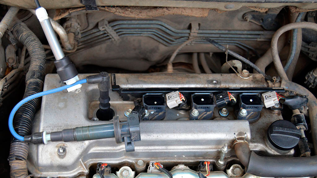 Conexión del sensor de sincronización por chispa en el sistema de encendido COP. (Adicionalmente se utiliza un cable de extensión de alta tensión).