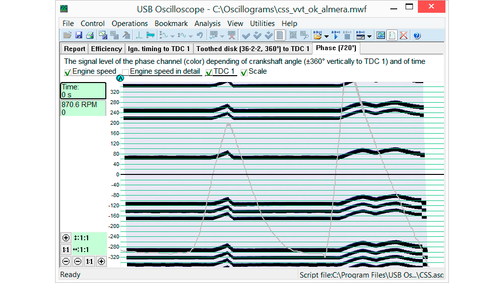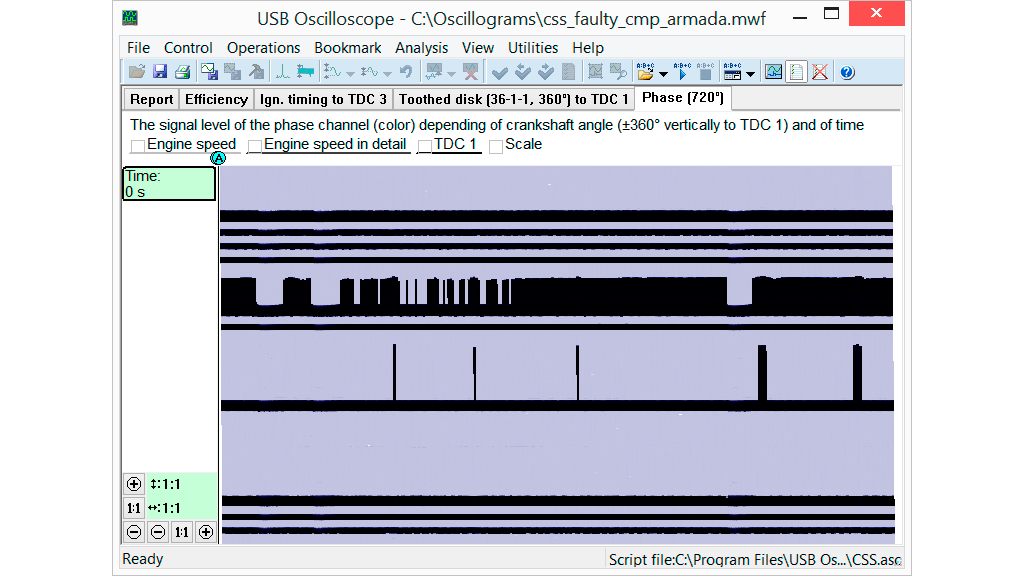 Hoja de informe “Fase” en un Nissan Armada. Sensor del árbol de levas está defectuoso: la anchura de los impulsos generados por el sensor no siempre coincide con el ancho de los dientes del reluctor.
