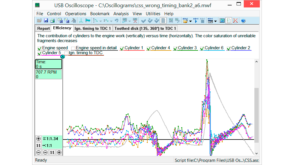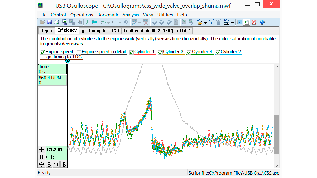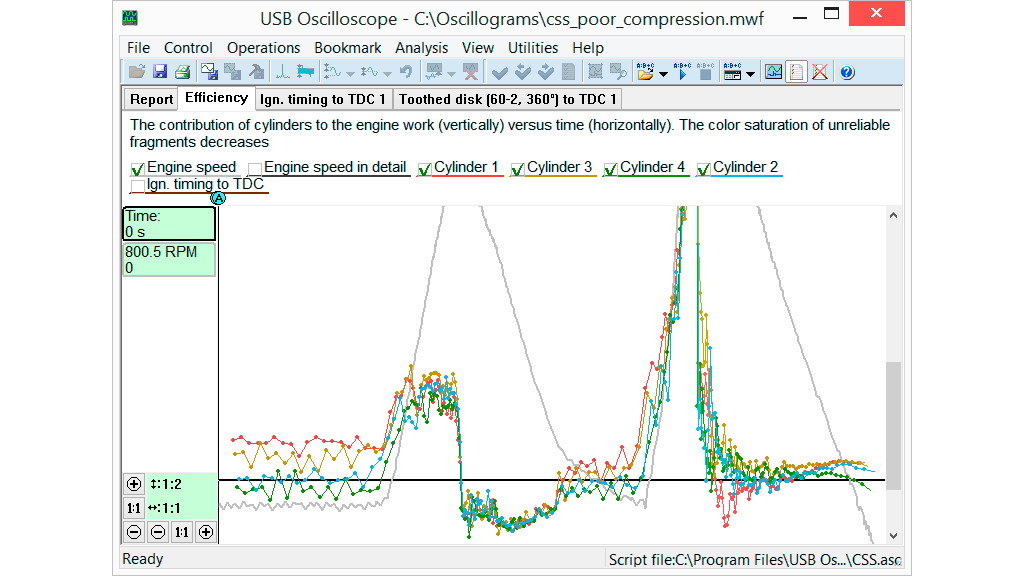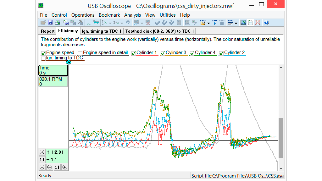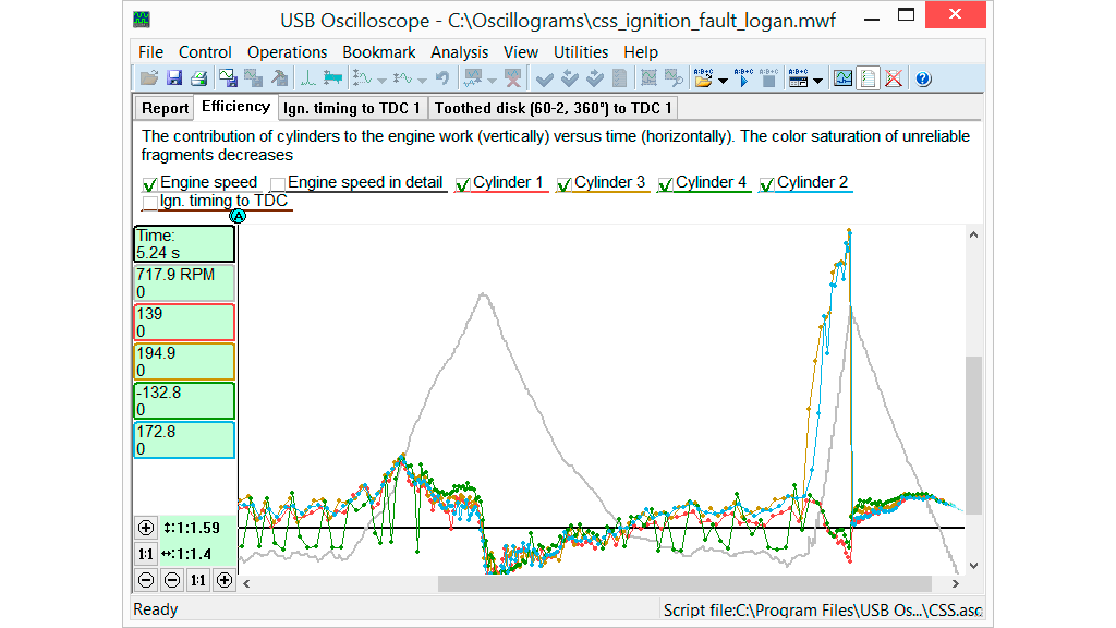 Hoja “Eficiencia” de informe del script CSS, en un Renault Logan. Bobina de encendido de los cilindros 1 y 4 defectuosa; luz entre los electrodos de la bujía en el cilindro 4 , demasiado pequeño.