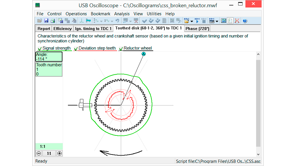 Hoja de informe “Rueda fónica” en un vehículo con la rueda del reluctor dañada, falta un diente.