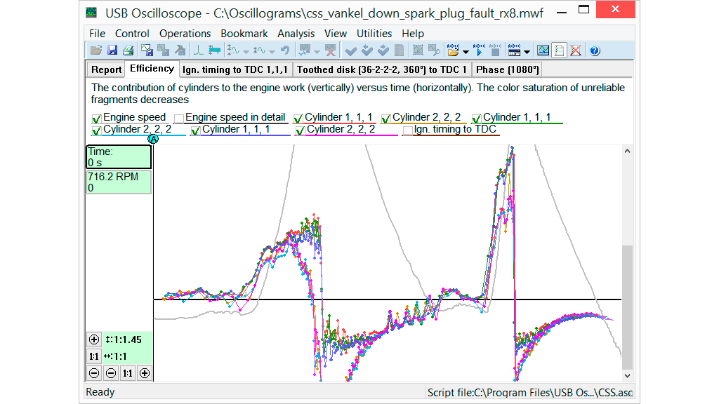 Hoja de informe “Eficiencia” de un motor Wankel (de pistón rotativo) en Mazda RX 8. La bujía inferior del segundo rotor es defectuosa.