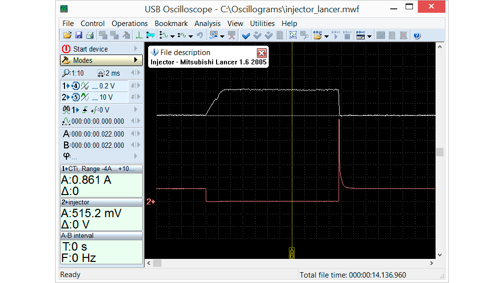El oscilograma de tensión y de corriente en el circuito de control de inyector del vehículo Mitsubishi Lancero 1.6 2005, grabado con el motor en marcha lenta.